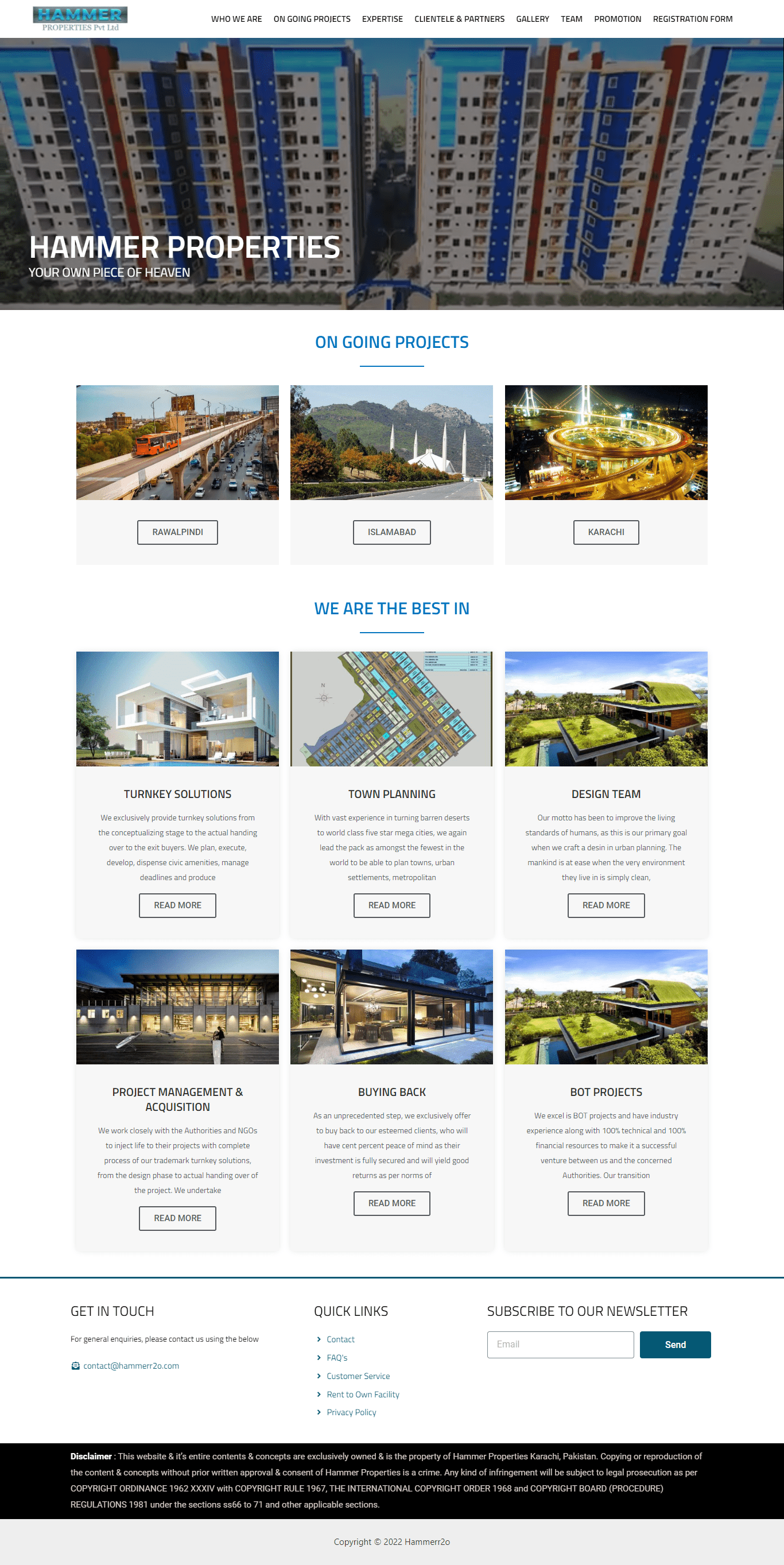 HAMMER PROPERTIES Pvt Ltd is a private entity with head office in Karachi, Pakistan. We are a team of professionals who are world authority in their own field of expertise, who actualize the inconceivable, giving it reality. We have achieved landmark progress in field of world class mass housing and other mega projects across the globe.
